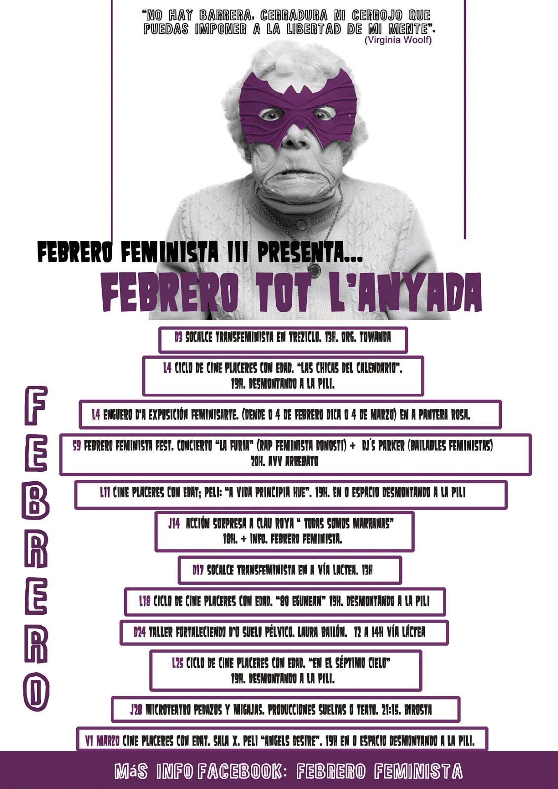 Como ya es habitual, los colectivos que participan en el Febrero Feminista organizan, a lo largo de este mes, numerosas actividades en torno al género.Talleres, charlas, exposiciones, conciertos y muchas otras cosas, que podréis apuntar en vuestra agenda.